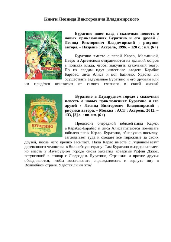 Читайте 8 книг автора онлайн: "Буратино ищет клад" (3 издания), "Конкурс красоты", "Австралия", "Буратино в Изумрудном городе", "Петрушка-художник", "Заметки путешественника".