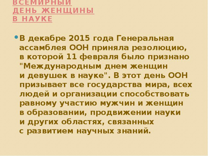 Резолюция Генеральной Ассамблеи A/RES/70/212 (22 декабря 2015 года) и Послание Генерального директора ЮНЕСКО о праздновании Международного дня женщин и девочек в науке.