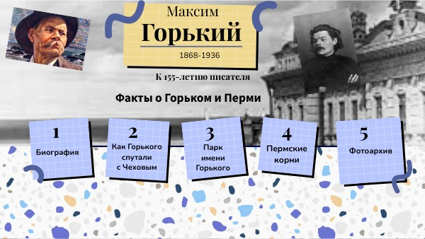 Пермь посещали выдающиеся деятели и знаменитые люди: А.Н. Радищев, А.И. Герцен, Ф.М. Достоевский, Д.Н. Мамин-Сибиряк, А. Гриневский (Грин), В.В. Маяковский, А.П. Чехов, в том числе, и М. Горький...